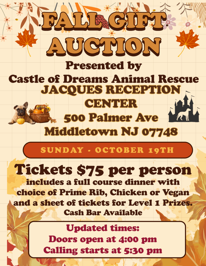 Join us for our largest fundraising event of the year at Castle of Dreams Animal Rescue’s Fall Gift Auction! Happening at the beautiful Jacques Reception Center in Middletown, NJ, your $75 ticket includes a delicious full-course dinner with your choice of Prime Rib, Chicken Marsala, or a tasty Vegan entrée, plus one sheet of Level One prize tickets to get the fun started! From fabulous prizes to amazing food, it’s the perfect way to celebrate the season while helping us continue our mission of rescuing and rehoming animals in need. To purchase tickets: https://www.zeffy.com/en-US/ticketing/fall-gift-auction